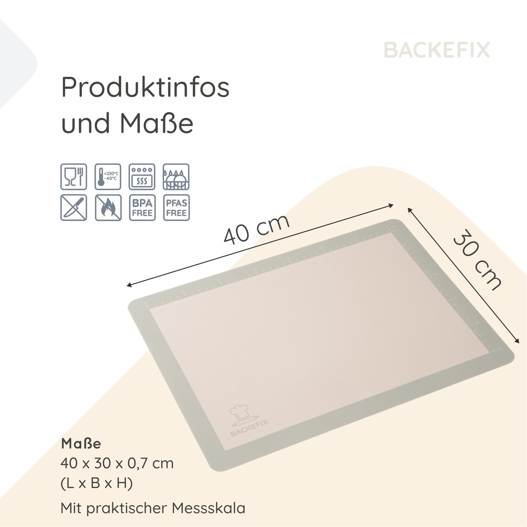 Die Matte misst 40×30 cm. Damit passt sie auf das vorgesehene Blech bzw. bietet genug Fläche für Teigarbeiten.